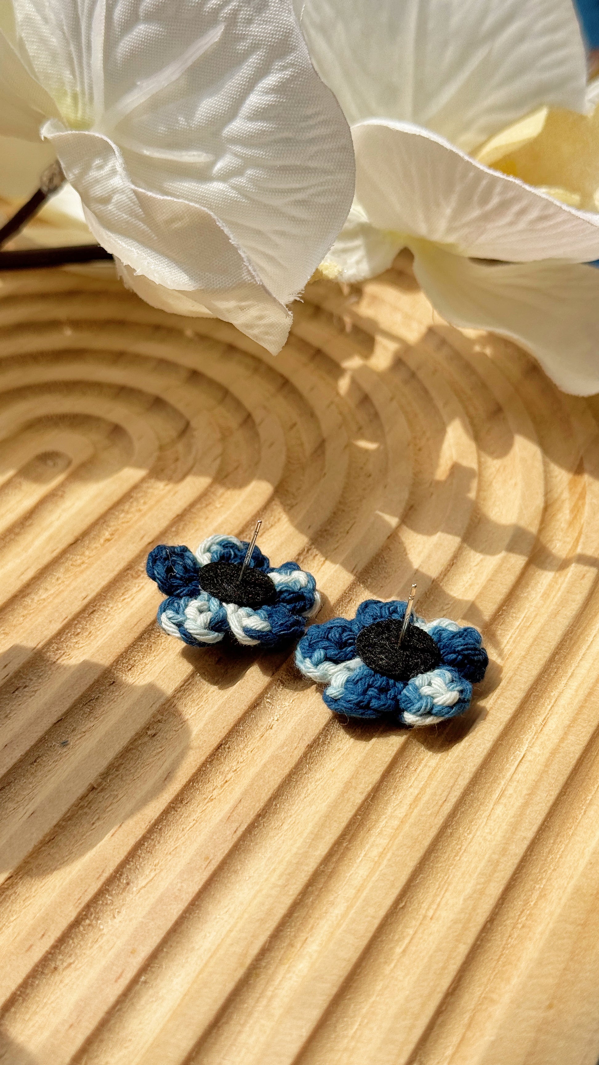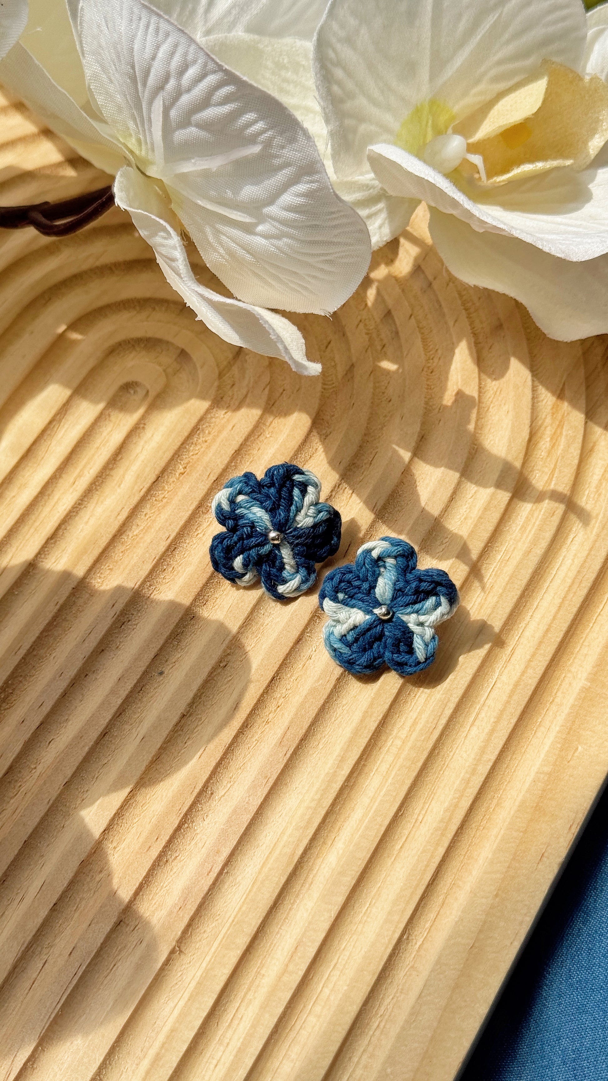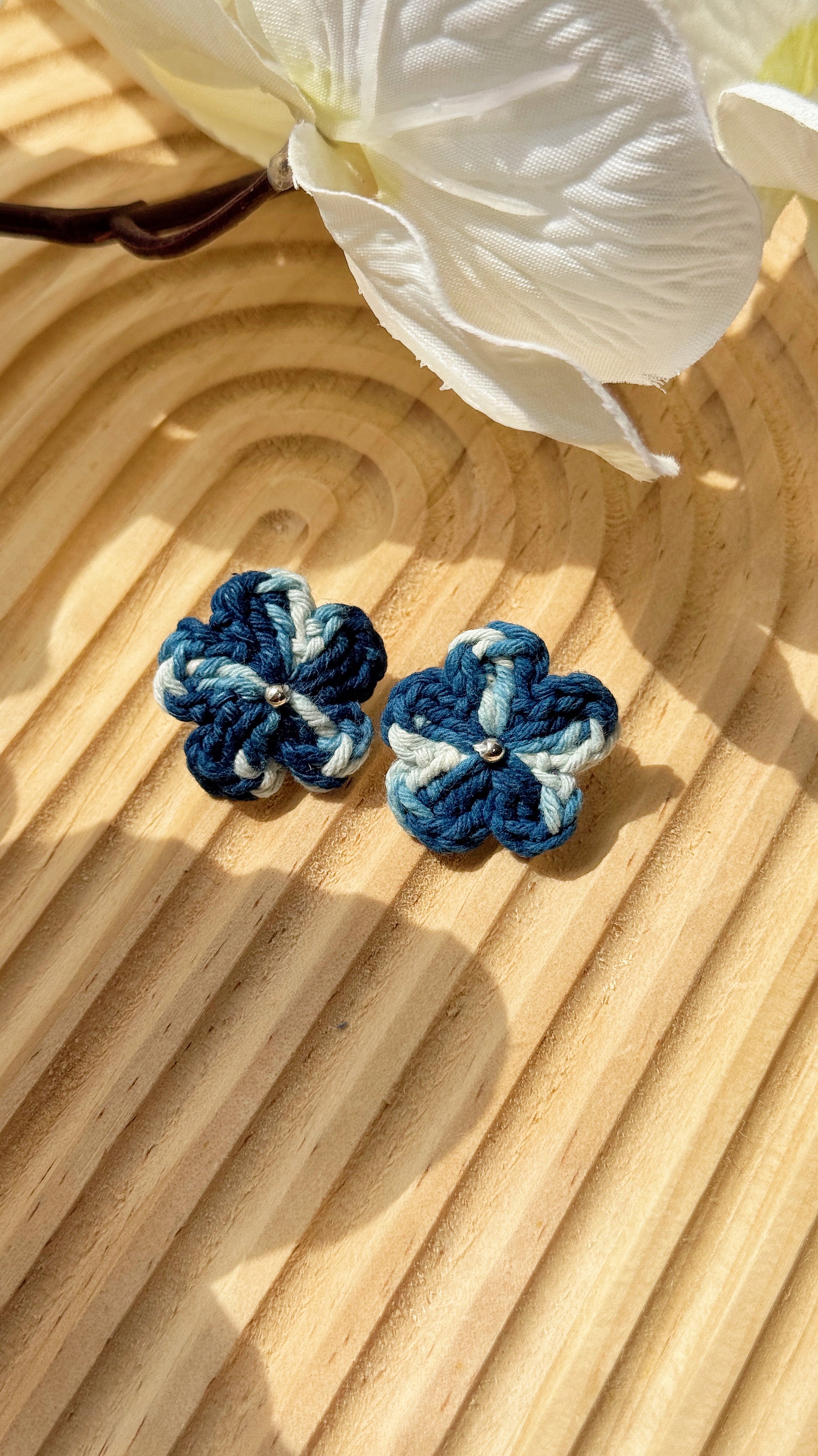 Made with hand-dyed indigo thread, these earrings are named after their shape—Plum Blossom, 梅 (mei). The rich gradient of deep blue and soft sky tones highlights the natural beauty of traditional indigo dye.